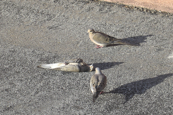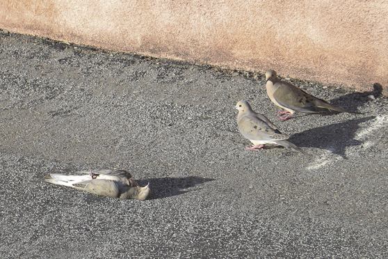 I came across this very curious scene recently in a Walnut Creek parking lot: a dead dove, flat on its back, being watched over by 2 others. Yes, watched over. I observed for at least 10 minutes, and they just didn’t want to leave. Were they expecting the dead one to get up and join them any second, or were they mourning a loss, showing respect?