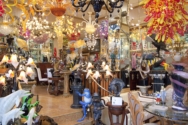 I did find myself dwelling on the questions “Who’s buying this stuff?” and “Is this place for real?” That is, how can they be paying their rent by selling this stuff? Are there that many tourists willing to pick up a massive ornamental stone lion or Dale Chiluly knockoff chandelier during their visit to SF? I’ve spent a couple of hours in these places altogether, and I’ve never seen anyone buying anything, not even the $10 bejeweled giraffe figurines by the front door. Just browsers. Gawkers, actually.